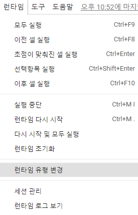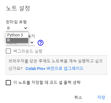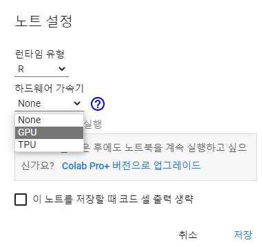 런타임 유형 변경을 클릭하면 파이썬이나 R을 선택할 수 있고, 하드웨어 가속기 설정도 가능합니다.