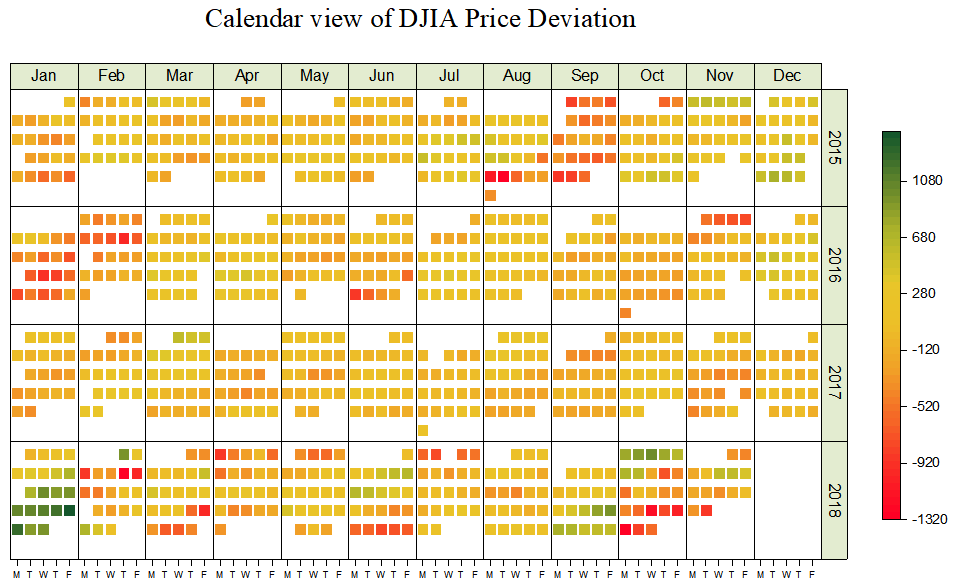 최근 몇 년 동안 다양한 그림을 그렸지만, 미세먼지 달력을 그렸을 때 가장 신이 났습니다. 아래 그림은 Origin Pro 예제인데, 미국 주식 달력입니다. 주중 5일 자료만 사용한 예제입니다. 이 템플릿을 이용해서 미세먼지 달력을 만들었습니다. 미세먼지 농도는 매일 측정하므로 주말 자료도 추가해야 합니다. 이 과정에서 여러 오류가 생겨서 고생했습니다.