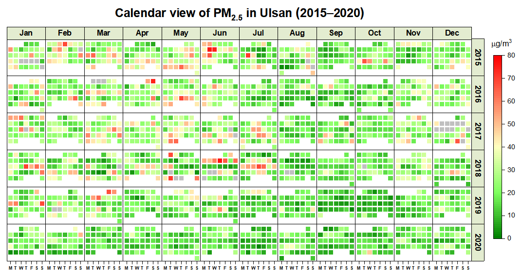 새벽 1~2시 정도에 아래 그림을 완성했는데, 너무 기분이 좋아서 자고 있는 아들과 아내를 깨워서 노트북 화면을 보여주었습니다. 이 그림을 보면 언제 울산에서 미세먼지 농도가 높았는지 아주 쉽게 파악할 수 있습니다. 예를 들어, 최근에 미세먼지 농도가 낮아지는 경향이 보입니다. 울산에서는 겨울 외에도 5, 6, 7월에도 빨간색이 많이 보입니다. 다른 도시와 달리, 울산에서는 남동풍이 우세한 늦봄~여름에 산업단지 영향을 많이 받아서 미세먼지 고농도 사례가 발생합니다. 이 그래프와 고농도 시기의 바람장, 역궤적, 기타 측정자료를 종합하여 울산의 미세먼지 오염 원인과 특성을 파악합니다.