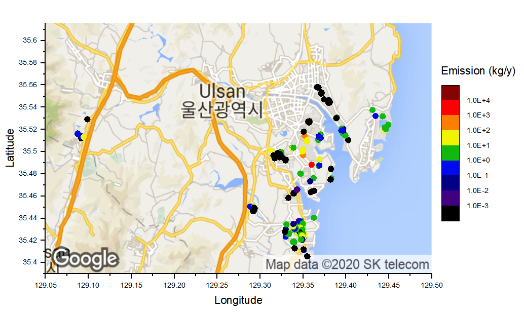 예전에 작성했던 울산의 오염물질 지도입니다. ArcGIS로 그리기 귀찮아서 간단히 Origin Pro로 그려봤습니다.