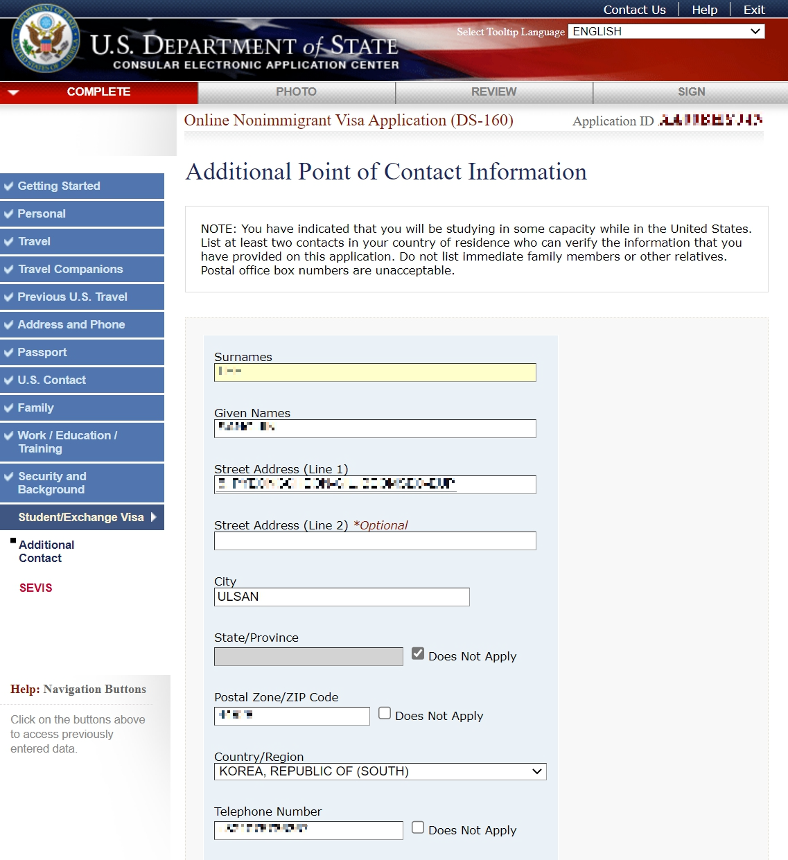 같은 방식으로 가족 J2 비자를 위한 DS-160 신청을 해야 합니다. 가족의 경우에는 입력 내용이 훨씬 적기 때문에 훨씬 쉽고 빠르게 신청할 수 있습니다.