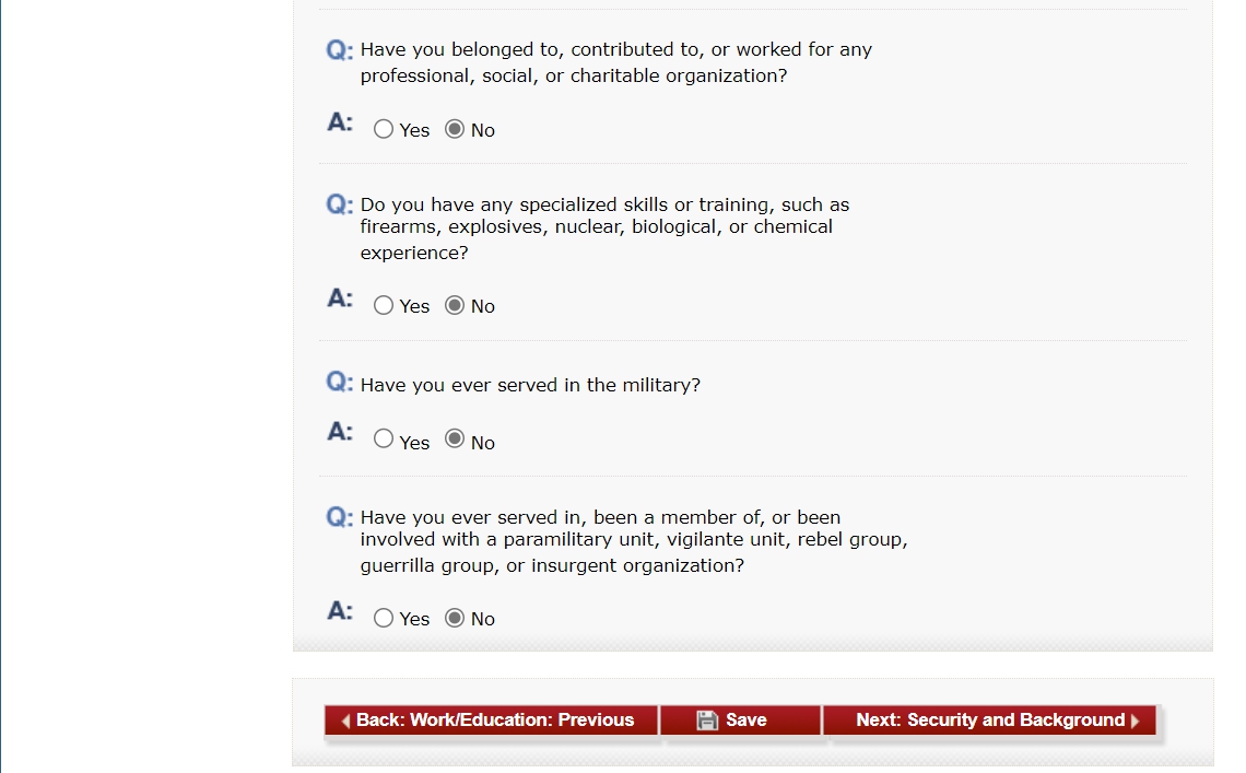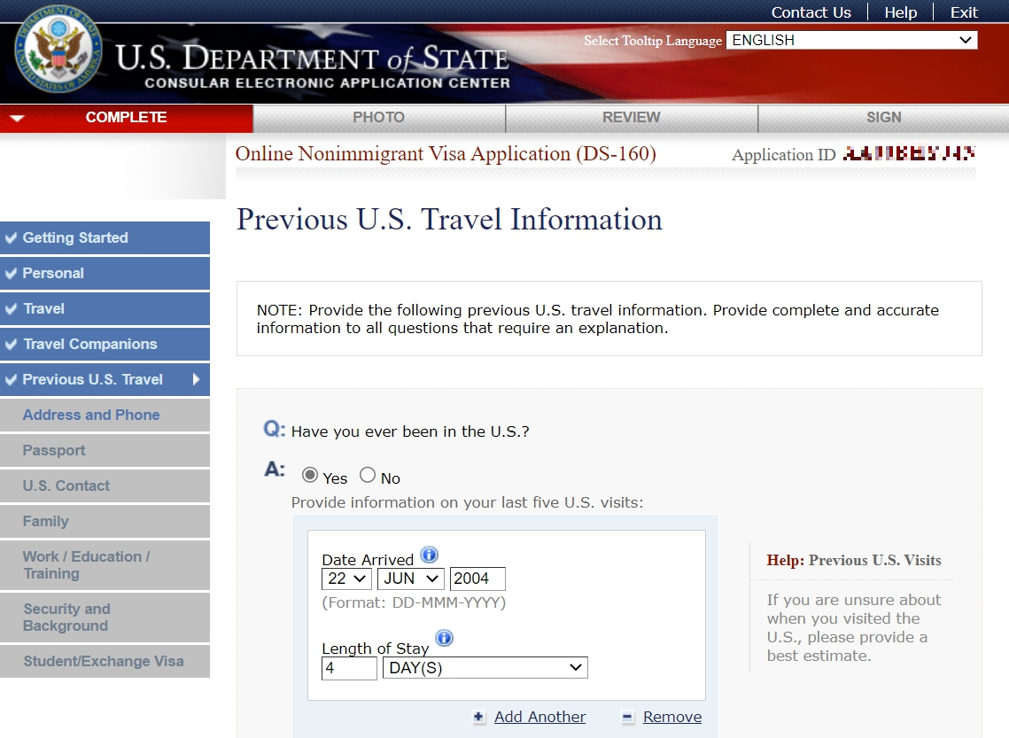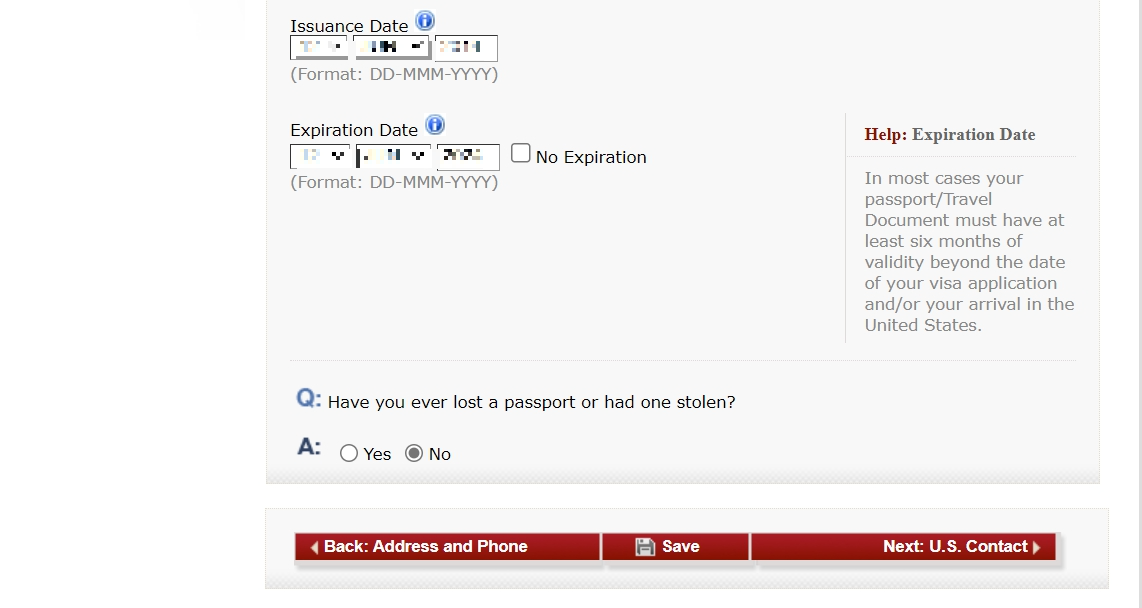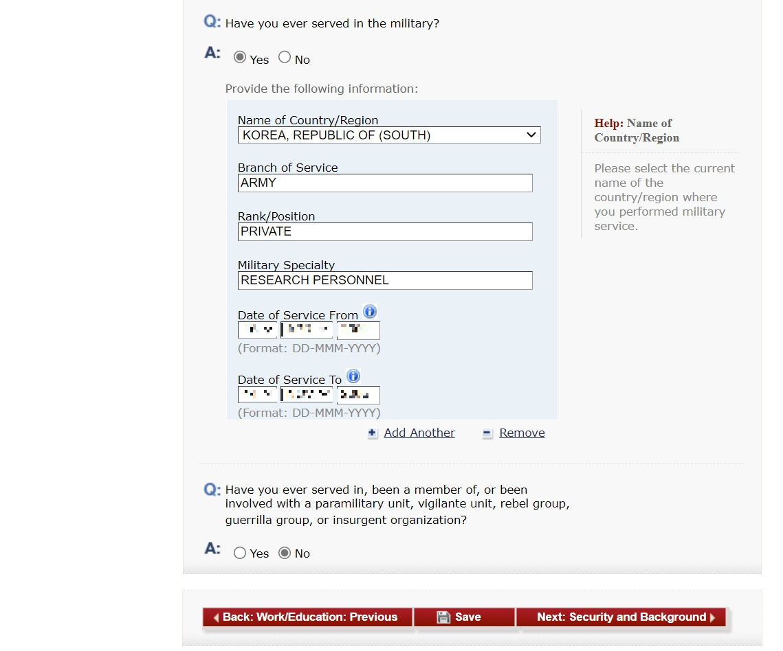 이전에 미국에 방문했던 정보를 입력합니다. 최근 5회까지 방문 시작 날짜와 기간을 입력합니다. 미국 비자 발급 내역도 입력합니다. 비자 번호는 비자에 있는 빨간색 번호입니다. Have you been ten-printed? 질문은 10개 손가락 지문을 제공했는지에 관한 내용입니다. 저는 2004년에 비자를 받았기 때문에 해당사항이 없고, 최근에 비자를 받은 분들은 Yes로 선택해야 합니다.