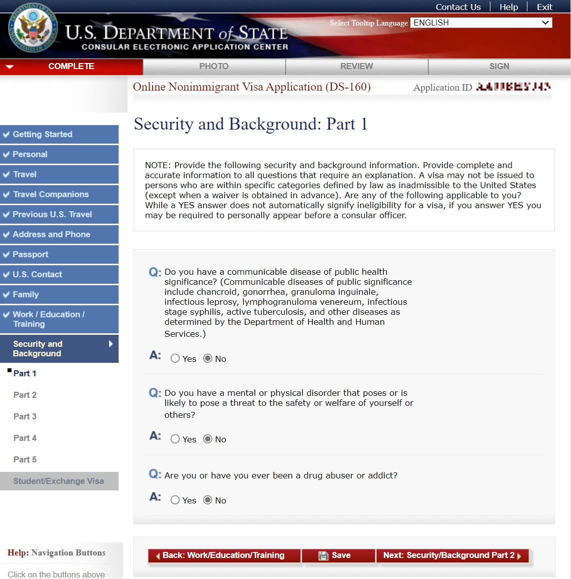 다음 화면에 Application ID가 나옵니다. 이 번호를 저장해 두어야 합니다. 보안 질문도 선택해야 합니다. 아버지 성함, 어릴적 별명 등 여러 예시가 있고 하나를 택해서 답변을 입력합니다. 시스템에서 자동 로그아웃이 되면 위 화면에서 RETRIEVE AN APPLICATION으로 들어가서 ID, 출생연도, 보안 질문 답변 등을 입력해야 기존에 저장된 내용을 불러올 수 있습니다.