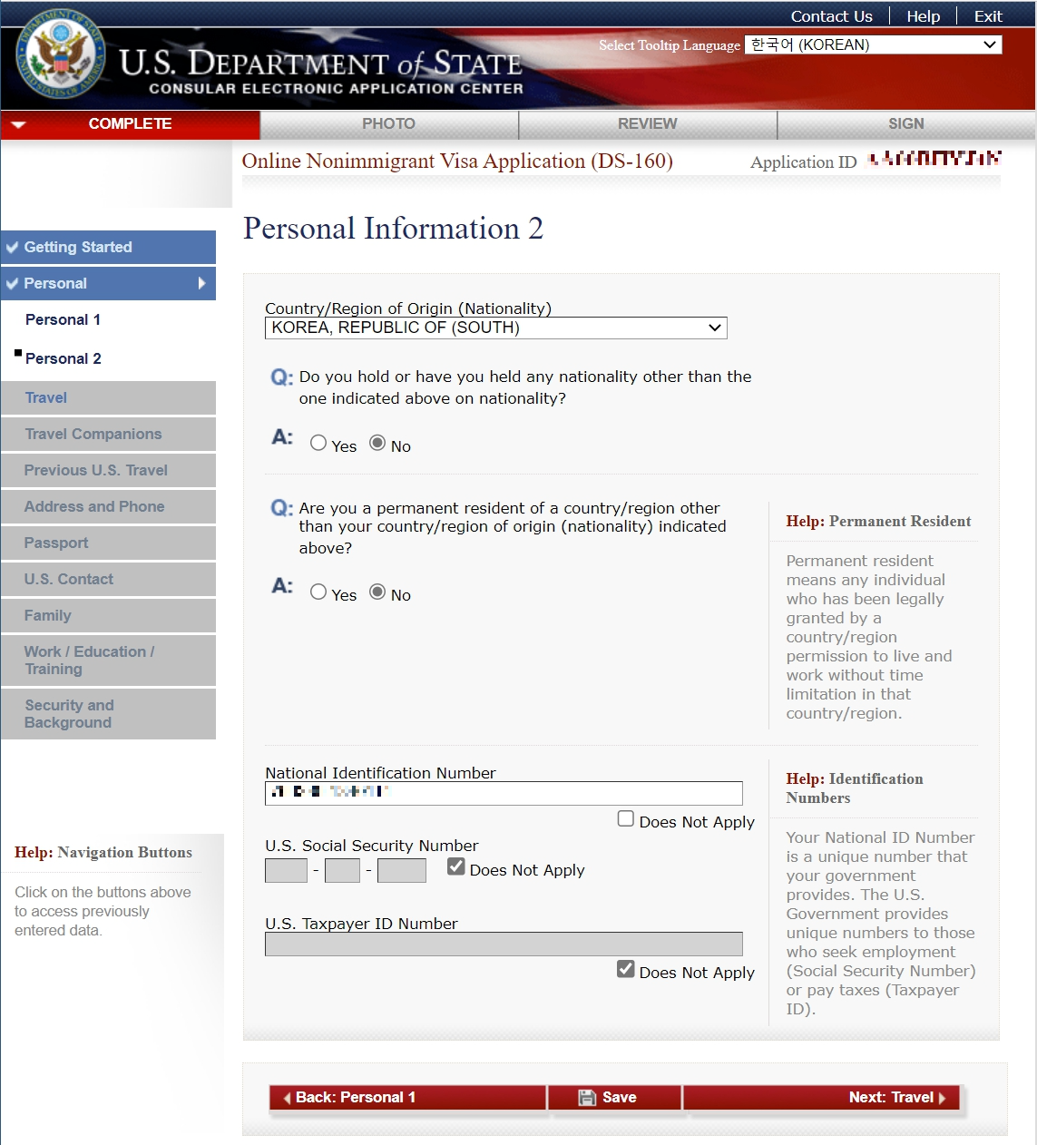 개인정보(Personal 2)를 입력합니다. National Identification Number에는 주민등록번호를 입력합니다.