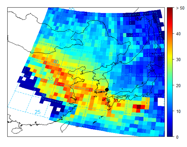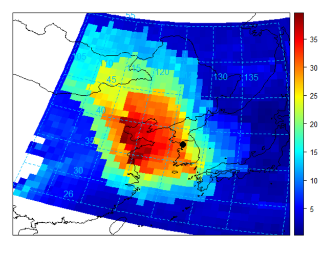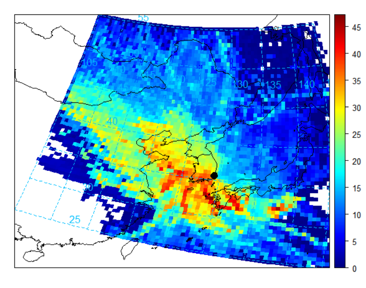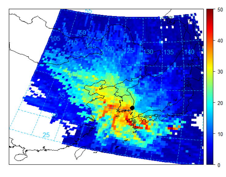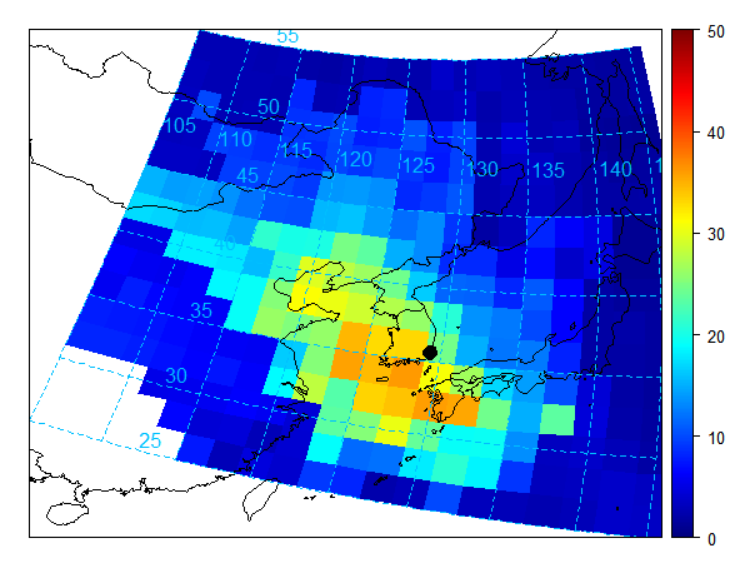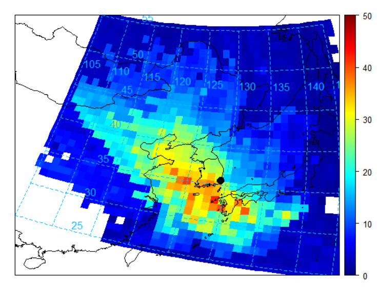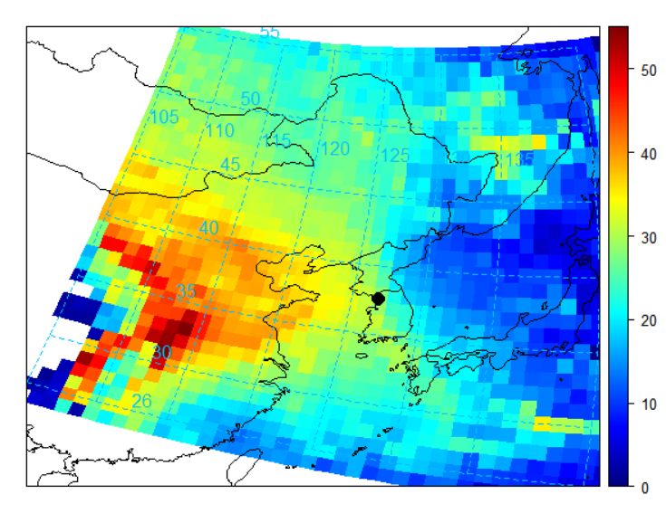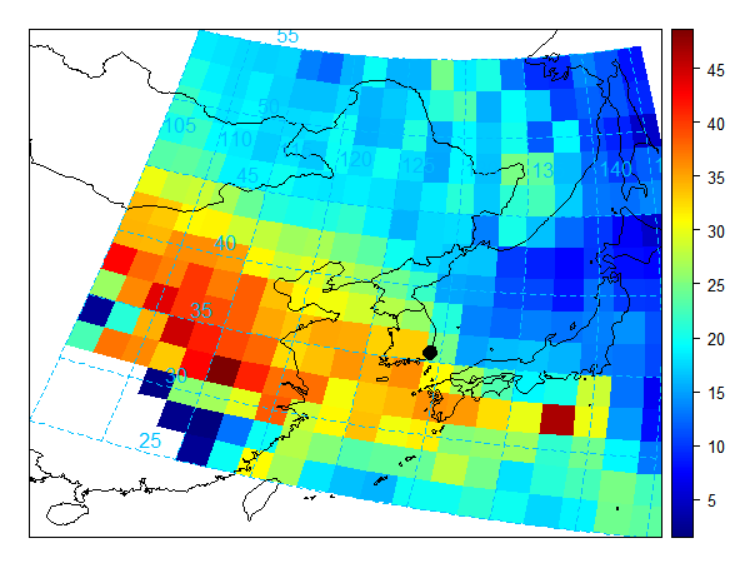 아래 그림은 8년 동안의 서울에서의 CWT 결과입니다. 미세먼지 주요 오염지역이 중국 중부로 기존에 알려진 오염지역과 매우 다르기 때문에 신뢰하기 어렵습니다.