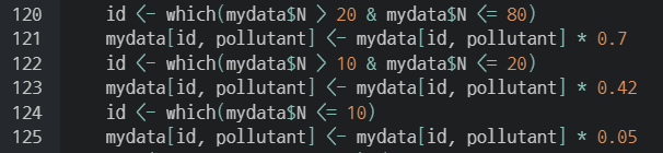 mydata[id, pollutant] <- mydata[id, pollutant] * 0.42