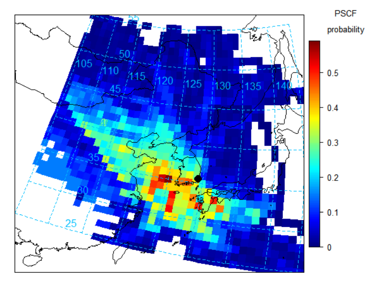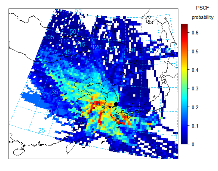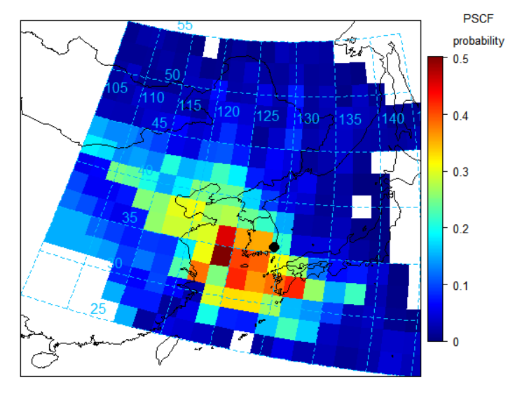 아래 그림은 PSCF 결과입니다. CWT 결과와 거의 비슷합니다.