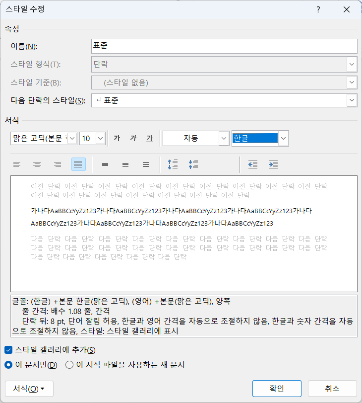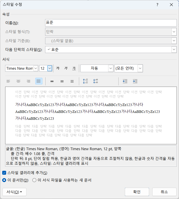아래 좌측 그림이 기본 설정인데, 한글과 영어어 폰트가 모두 맑은 고딕입니다. 모든 언어를 선택하고 폰트를 Times New Roman으로 설정하면 됩니다.
