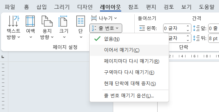 레에아웃 리본 메뉴에서 줄번호를 추가합니다.