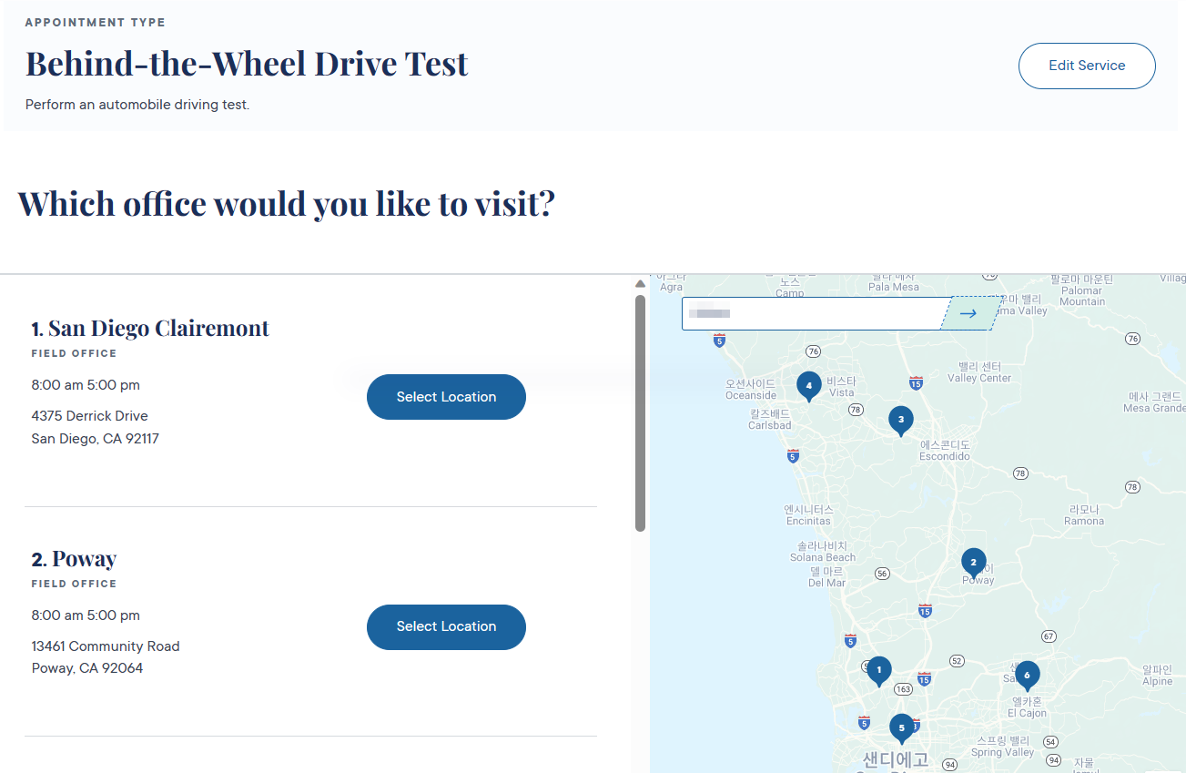실시 시험 장소(DMV)를 지도에서 확인하고 선택합니다.