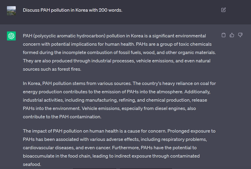 이 기능을 평가해 보기 위해서 Chat GPT에게 한국의 PAH 오염에 대해서 토의하라고 했습니다.