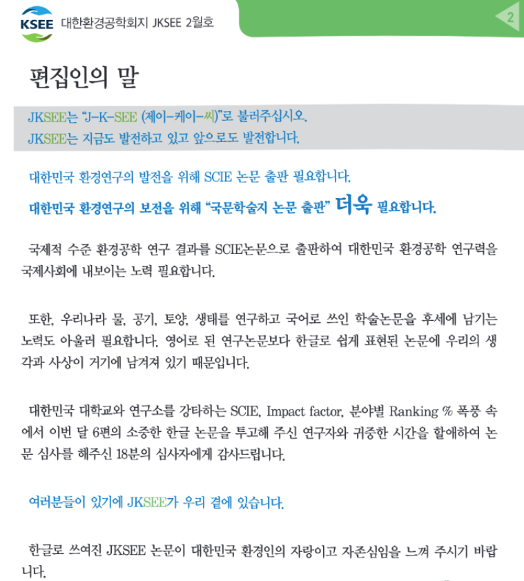 올해부터 대한환경공학회 국문학술지 부편집장(대기 분야) 업무를 하고 있습니다. 아래는 편집장이신 정승우 교수님께서 올해 2월 학회 소식지에 작성하신 글입니다. 국문학술지의 필요성을 절절하게 호소하셨습니다.