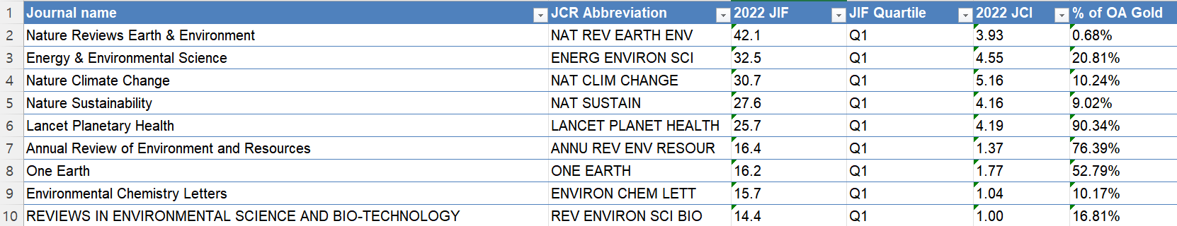 - 현재, 환경분야 IF 상위권 저널은 Nature 자매지와 리뷰 학술지가 차지하고 있습니다. 전통있고 수준 높은 환경분야 전문 학술지를 상위권에서 찾기 어렵습니다.