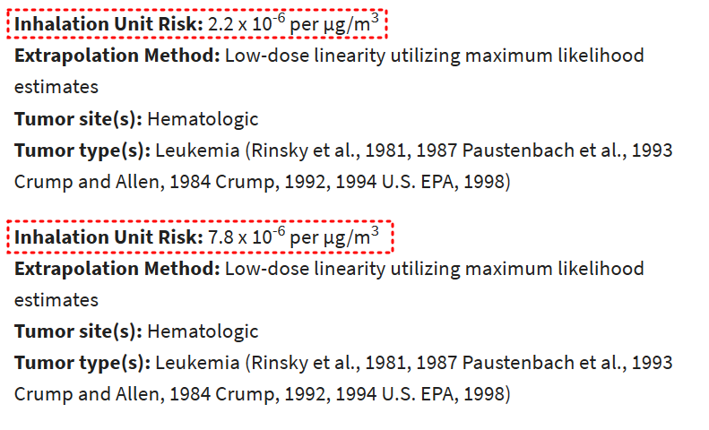 예를 들어, 아래와 같이 벤젠의 단위 위해도 값이 두 개 있습니다(Benzene CASRN 71-43-2 | IRIS | US EPA, ORD). 보수적인 관점에서는 큰 값을 사용합니다. 그러나 일부 연구자는 작은 값을 사용해서 항상 위해도를 낮게 보고하기도 합니다.