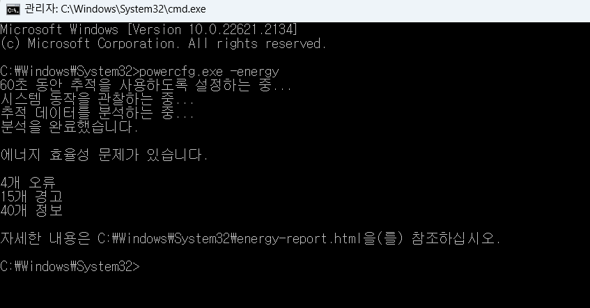 명령창(관리자 권한 실행)에서 배터리 수명을 확인해도 별 문제는 없습니다. 그러나 만 5년 전에 구입한 노트북(실사용 4년)이라서 배터리를 교체할 시기인 것 같습니다.