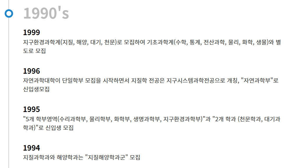 서울대학교 자연과학대학에서는 1994년부터 일부 학과 통합이 이루어지면서 부분 학부제가 실시되었고, 1996년에는 아예 자연대 단일학부로 통합하여 학생을 선발했습니다. 아래 그림은 서울대 지구환경과학부의 1990년대 변천사입니다. 현재는 지구환경과학부로 선발하고 세부 전공 선택 없이 졸업하고, 대학원에 진학하면 지질, 해양, 대기 전공으로 나뉩니다. 천문학과는 물리학과와 통합하여 물리천문학부로 소속입니다.