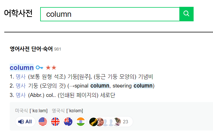 Column 발음은 미국식으로는 칼럼이고 영국식으로는 컬럼입니다.
