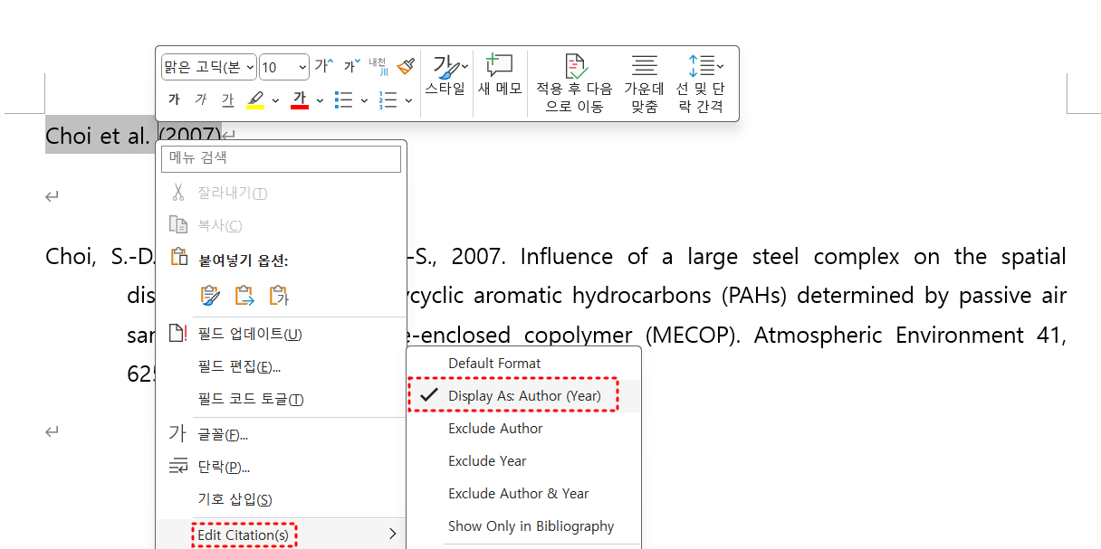 EndNote 기본 서식은 (Choi et al., 2023)이므로 Choi et al. (2023)로 입력할 때는 마우스 우클릭해서 별도 서식 선택해야 함
