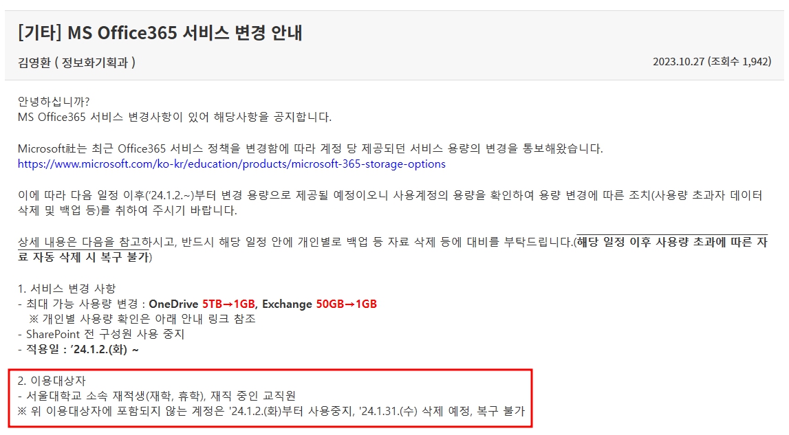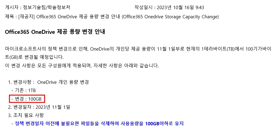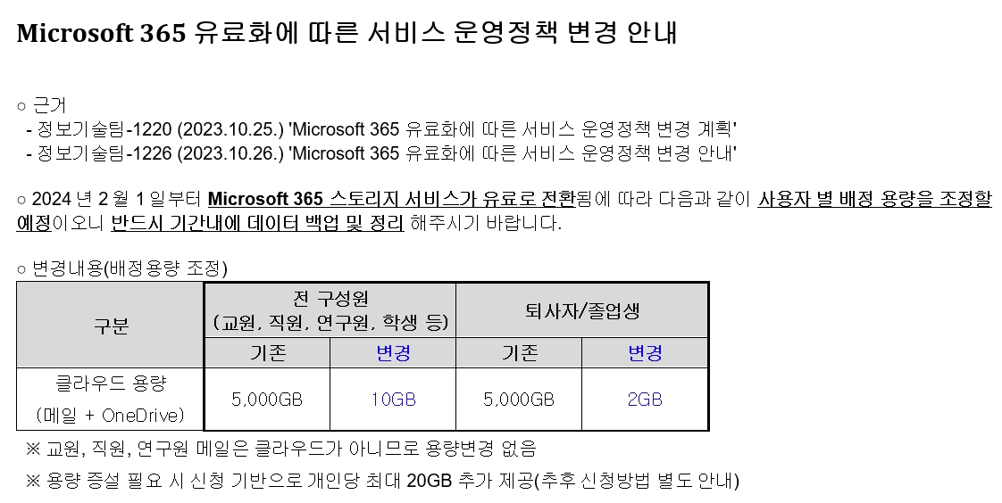 앞으로 학교별로 100 TB로 제한한다고 합니다. 지금까지 개인별로 무료로 5 TB까지 사용했었는데, 학교 전체에서 100 TB만 무료 지원만 한다니 학교 입장에서는 개인별 용량을 줄이거나 졸업생 계정 자료를 삭제해야 합니다. 아직 언론에 제대로 알려지고 있지 않은데(글 올리고 하루 만에 기사가 나왔습니다 MS마저… ‘공짜 클라우드’ 변심에 대학가 비상), 연말이나 내년 초에 크게 당황하는 사람들이 많이 생길 수 있습니다. 특히, 졸업생 계정을 사용하던 사람들은 전혀 모르고 있다가 자료가 삭제될 수 있습니다.