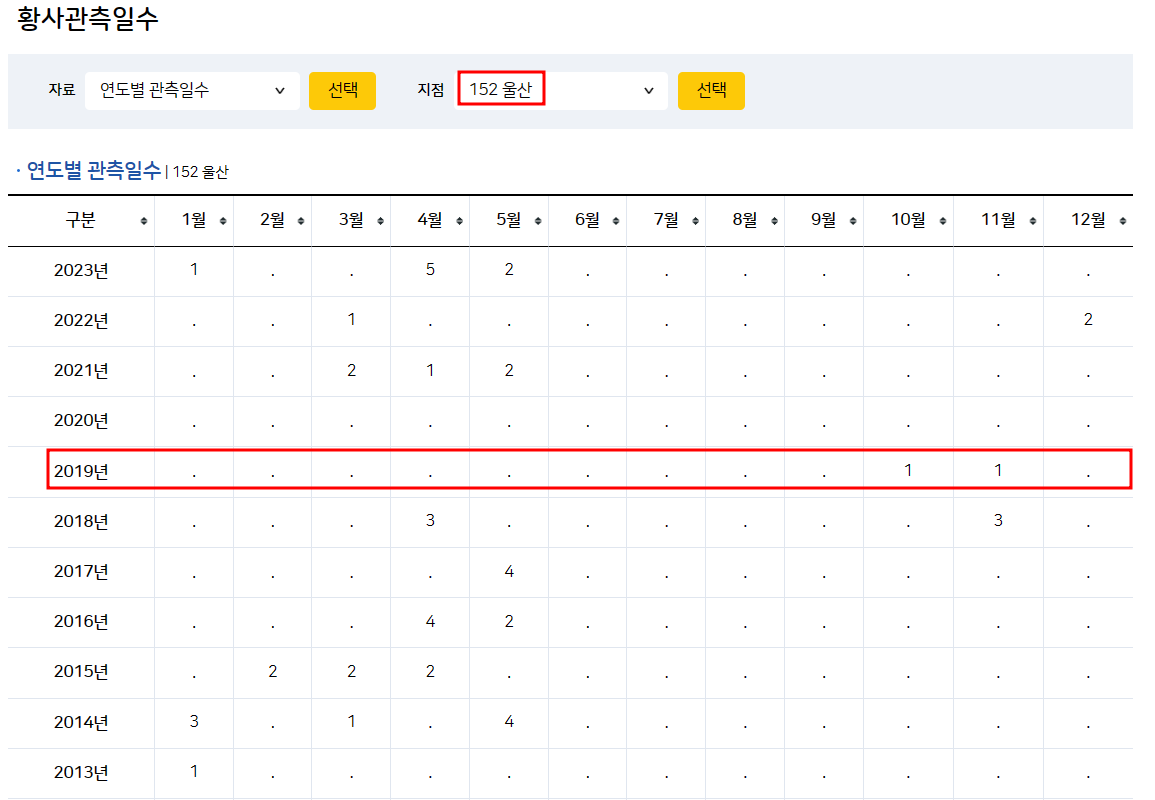 기상청 황사 자료에 의하면, 2019년 울산에서는 가을에만 황사 현상이 관측되었습니다.