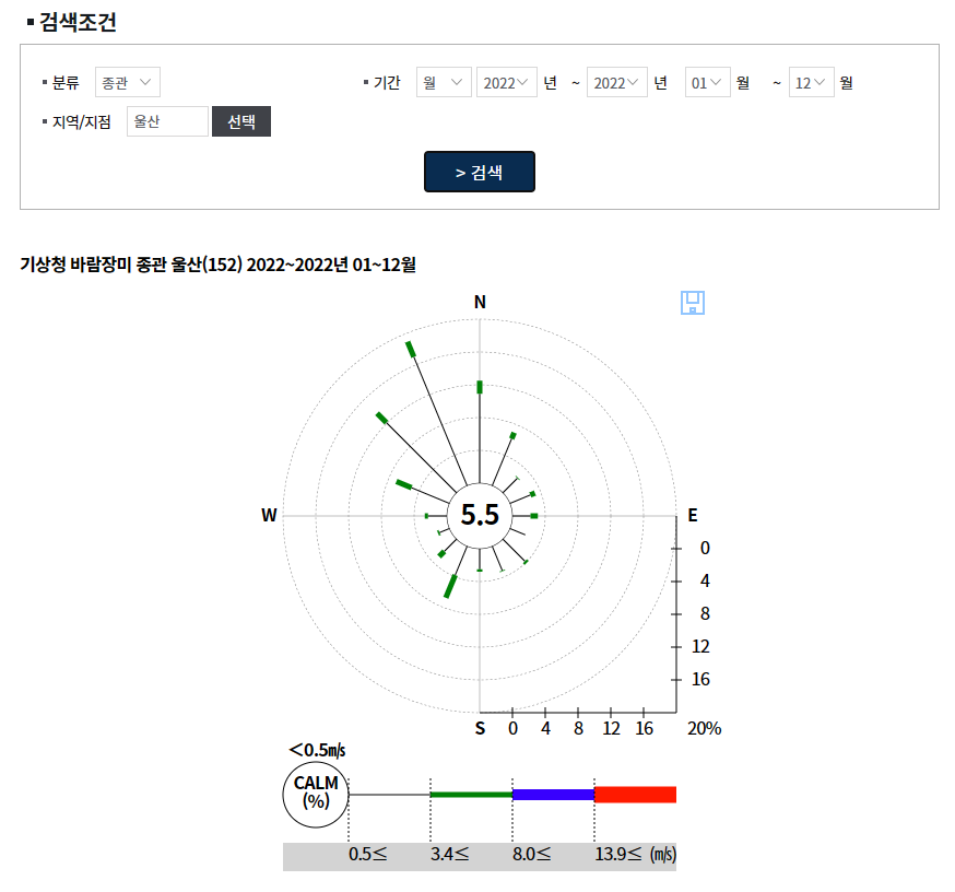 기상자료개방포털[기후통계분석:계급별일수:바람 계급별일수(바람장미)] (kma.go.kr)