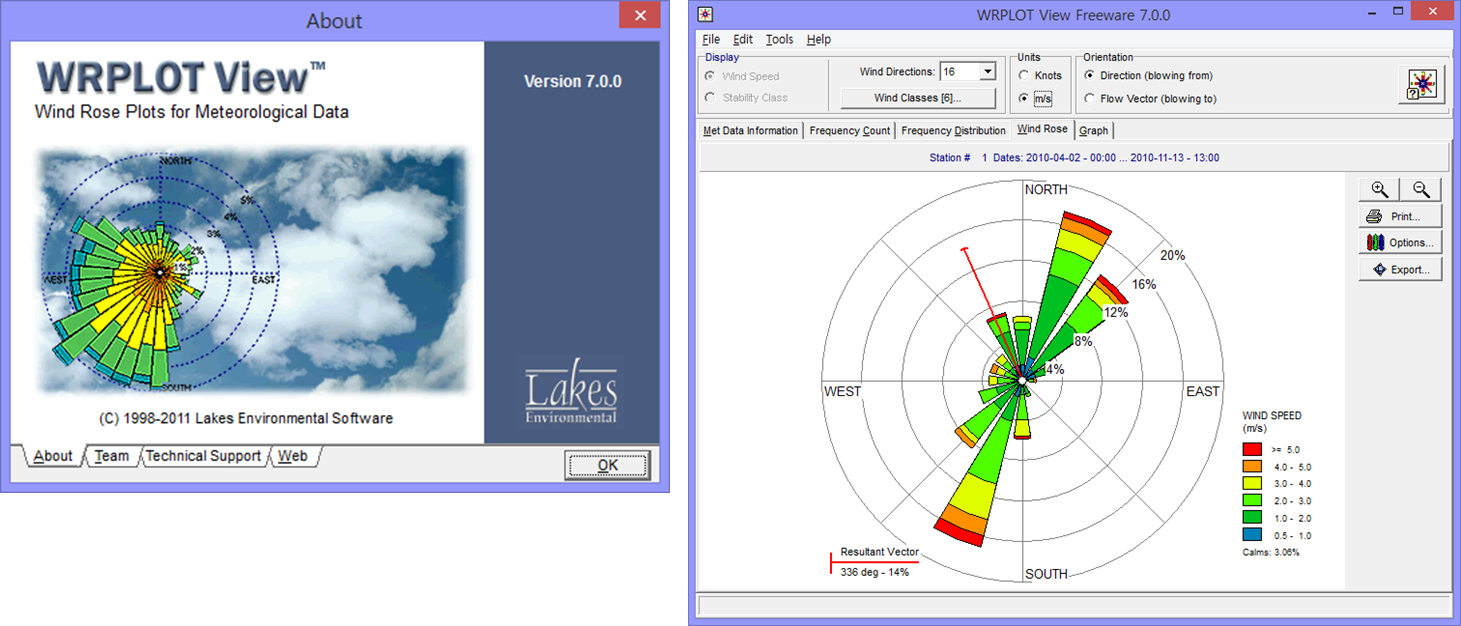 많은 프로그램을 사용하여 바람장미를 그릴 수 있는데 제가 가장 선호하는 프로그램은 WRPLOT View입니다. 이 사이트(WRPLOT View | Lakes Environmental Software (weblakes.com)에서 무료로 다운로드 받을 수 있습니다. 처음 사용하는 학생은 다소 어려울 수도 있는데 설명서를 읽으면 큰 문제 없이 사용 가능합니다. 대기오염 수강 학부생들 대부분이 사용합니다. 아래 우측 그림은 제가 좋아하는 풍속 범위, 색상, 서식 등을 지정해서 직접 만들었던 바람장미입니다.