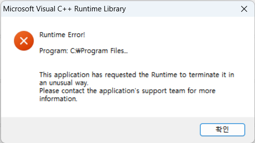 며칠 전부터 비주얼 C++ 런타임 오류가 생겨서 아래 에러 창이 계속 떴습니다. 컴퓨터 사용에는 문제가 없었지만 여간 신경이 쓰이는 것이 아닙니다.