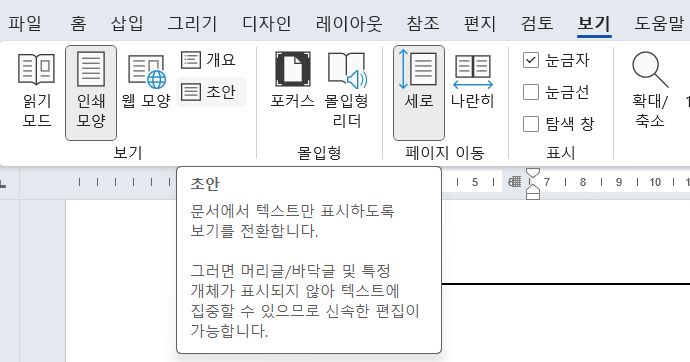 보기 → 인쇄모양으로 다시 돌아오면 아래와 같이 각주 구분선 아래에 있던 공백이 사라집니다.