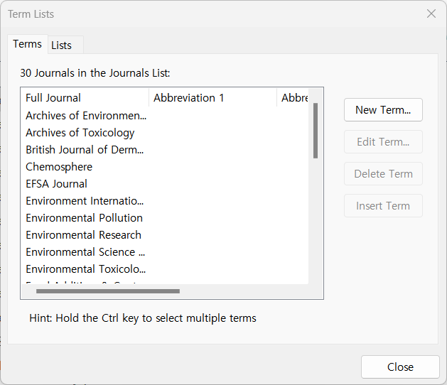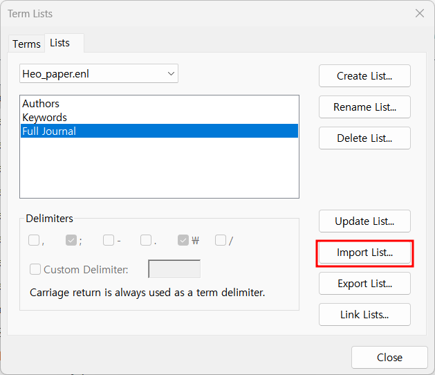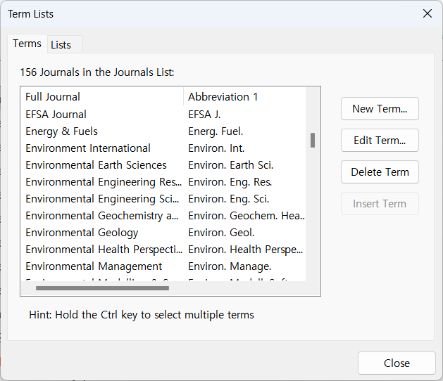 EndNote 서지 정보에는 저널명 full name을 기입합니다. 그러나 여러 저널에서는 참고문헌 목록에 약어를 사용합니다. 그래서 EndNote에 별도로 Journal Term List를 입력해야 합니다. 우선 본인만의 Journal Term List 파일을 갖고 있어야 합니다.