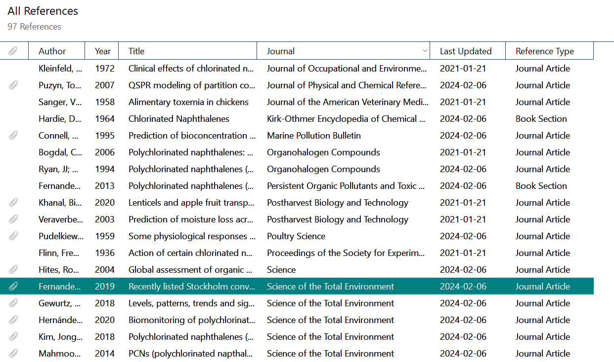 EndNote의 참고문헌 목록입니다. 제목, 저널명, 참고문헌 종류 등에 문제가 없는지 검토합니다.