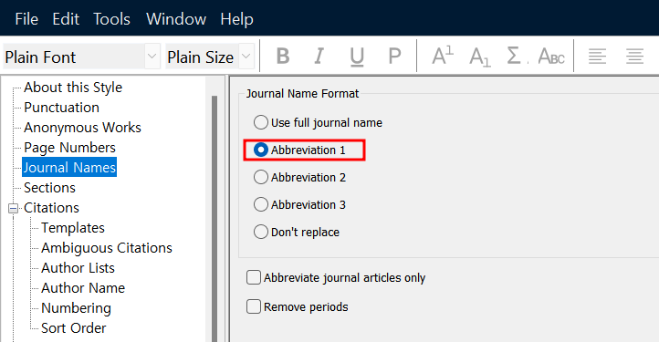 EndNote 리본 메뉴 Tools → Output styles → Edit "투고 저널" 선택하면 아래 창이 나옵니다. 저널명을 약어 1로 선택합니다.