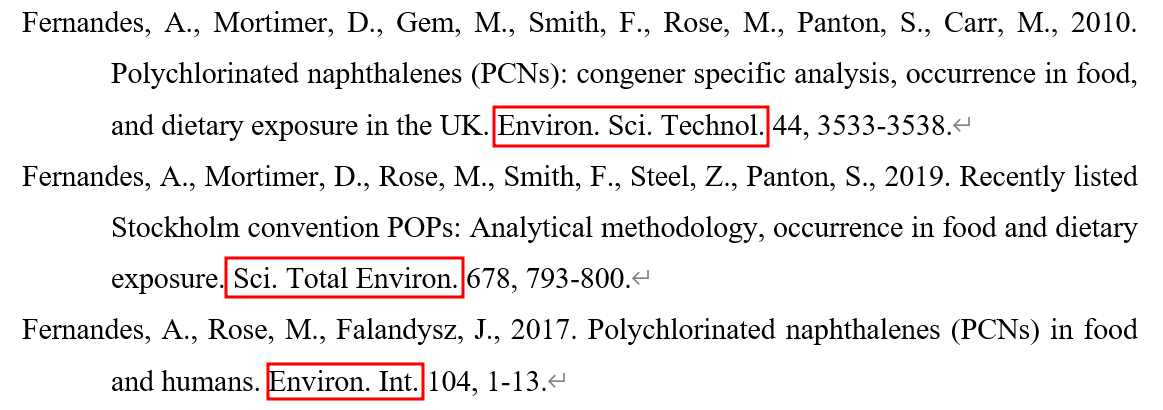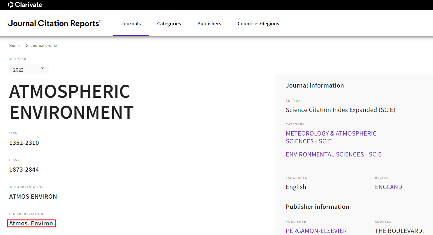예를 들어, Atmospheric Environment의 ISO 약어는 Atmos. Environ.입니다. 단어가 축약될 때는 마침표가 포함되고, 완결된 단어인 경우에는 마침표가 없습니다. 예를 들어 Food Chemistry의 약어는 Food Chem.입니다. Food는 약어가 아니므로 마침표가 붙지 않습니다. 보통 우리가 많이 투고하는 Elsevier 저널에서는 약어에 마침표를 붙이고, Springer 저널에서는 약어에 마침표를 붙이지 않습니다. 만약 JCR에서 저널이 검색되지 않으면 해당 저널 홈페이지에 방문해서 약어를 찾아야 합니다.