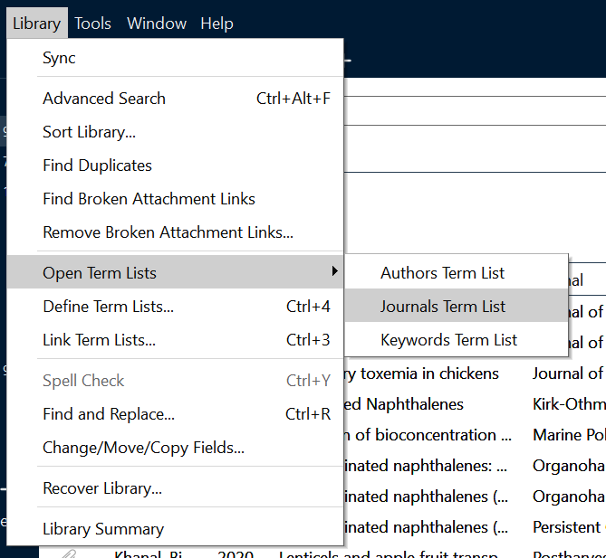 리본 메뉴에서 Library → Open Term Lists → Journals Term List를 선택합니다.