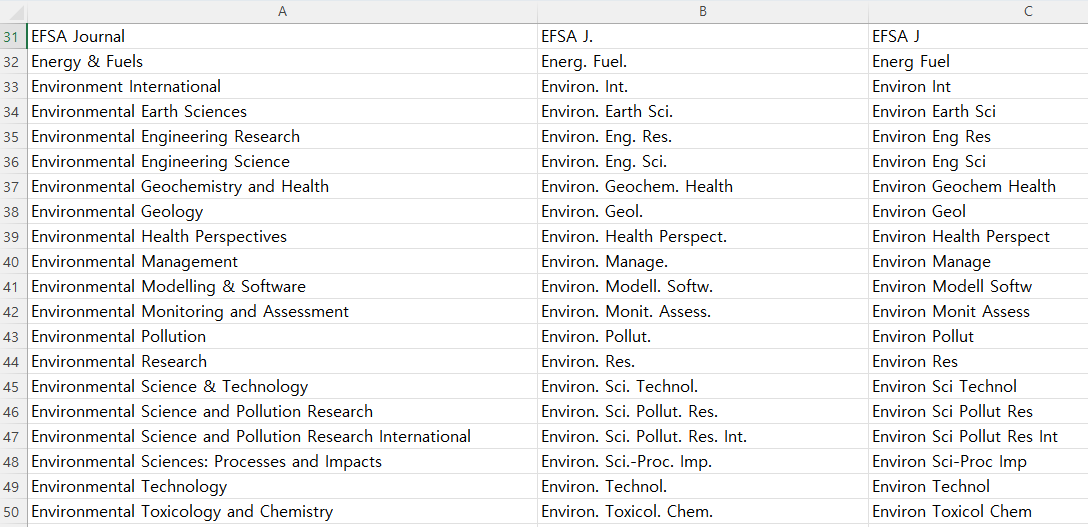 아래 엑셀 화면과 같이 본인이 인용한 저널의 full name, 약어 1(마침표 포함), 약어 2(마침표 불포함)를 세 열로 정리합니다. 저는 오늘 추가한 저널 포함해서 전체 155개의 저널의 약어가 정리된 파일을 가지고 있습니다. 엑셀 파일을 다른 이름으로 저장(txt 파일, 탭으로 구분)합니다.