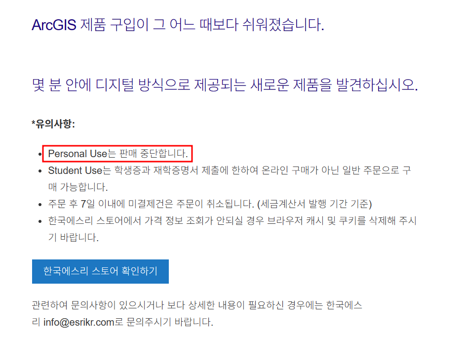 한국 Esri 사이트에는 아래와 같이 "ArcGIS 제품 구입이 그 어느 때보다 쉬웠다"고 하는데 올해부터인가 일반인(개인 연구자 포함) 대상의 저렴한 1년 구독(연간 100불)이 없어졌습니다. ArcGIS는 기업이나 대학에서 단체 구독하지 않은 경우에 개인 연구자가 구입할 수 있는 수준이 아닙니다.