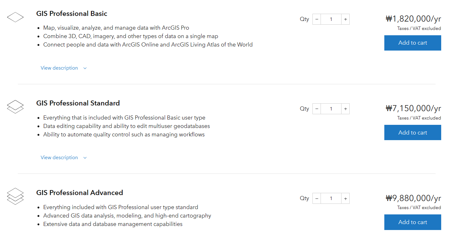 일반인이 Personal Use를 구독할 수 없으면 아래 요금을 내야 합니다. 기업체에서는 별 문제가 없는데 단체구독을 하지 않는 연구소나 대학의 개별 연구자가 구독하기에는 너무 비싼 금액입니다. 학생 때 교내에서 무료로 많이 사용하다가 라이센스가 없는 곳에 취업하면 많이 답답할 것 같습니다. 그래서 QGIS로 어쩔 수 없이 넘어가는 것이겠지요.