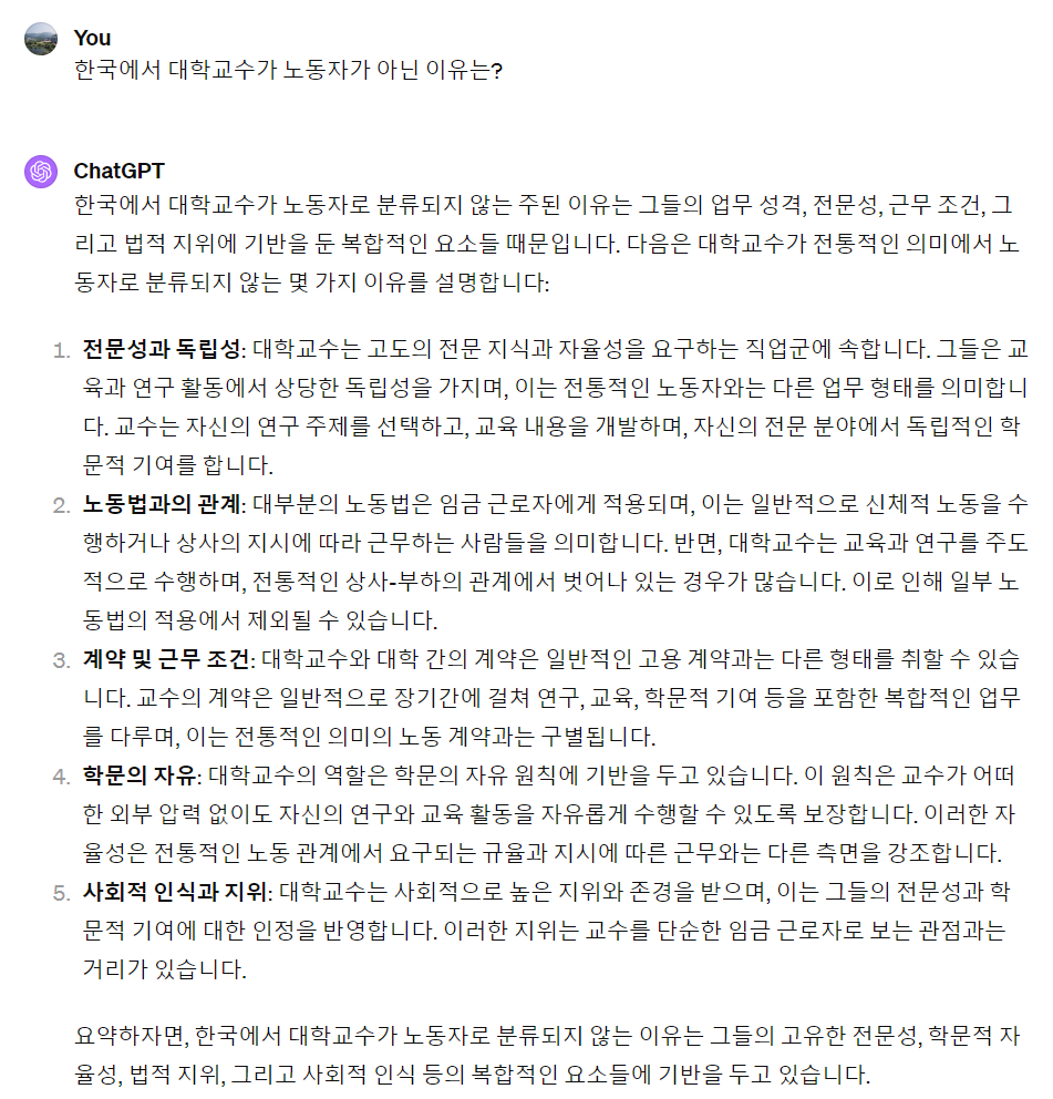 교수의 출퇴근에 대한 ChatGPT 답변입니다.