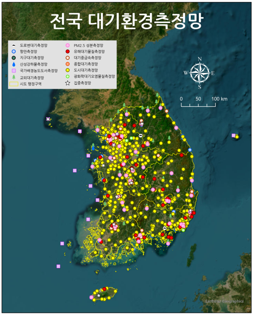 아래 그림을 회의에서 직접 사용할 수는 없고, ArcGIS Pro를 실행하고 세부 지역을 살펴보면서 도시별 측정소 분포와 역할에 대해서 더 고민하려고 합니다. 전 세계적으로 면적대비 이렇게 많은 측정소를 가지고 있는 나라가 없을 것 같습니다. 그러나 측정망에서 산출되는 빅데이터를 얼마나 잘 활용하는가에 관한 종합적인 검토가 필요합니다.