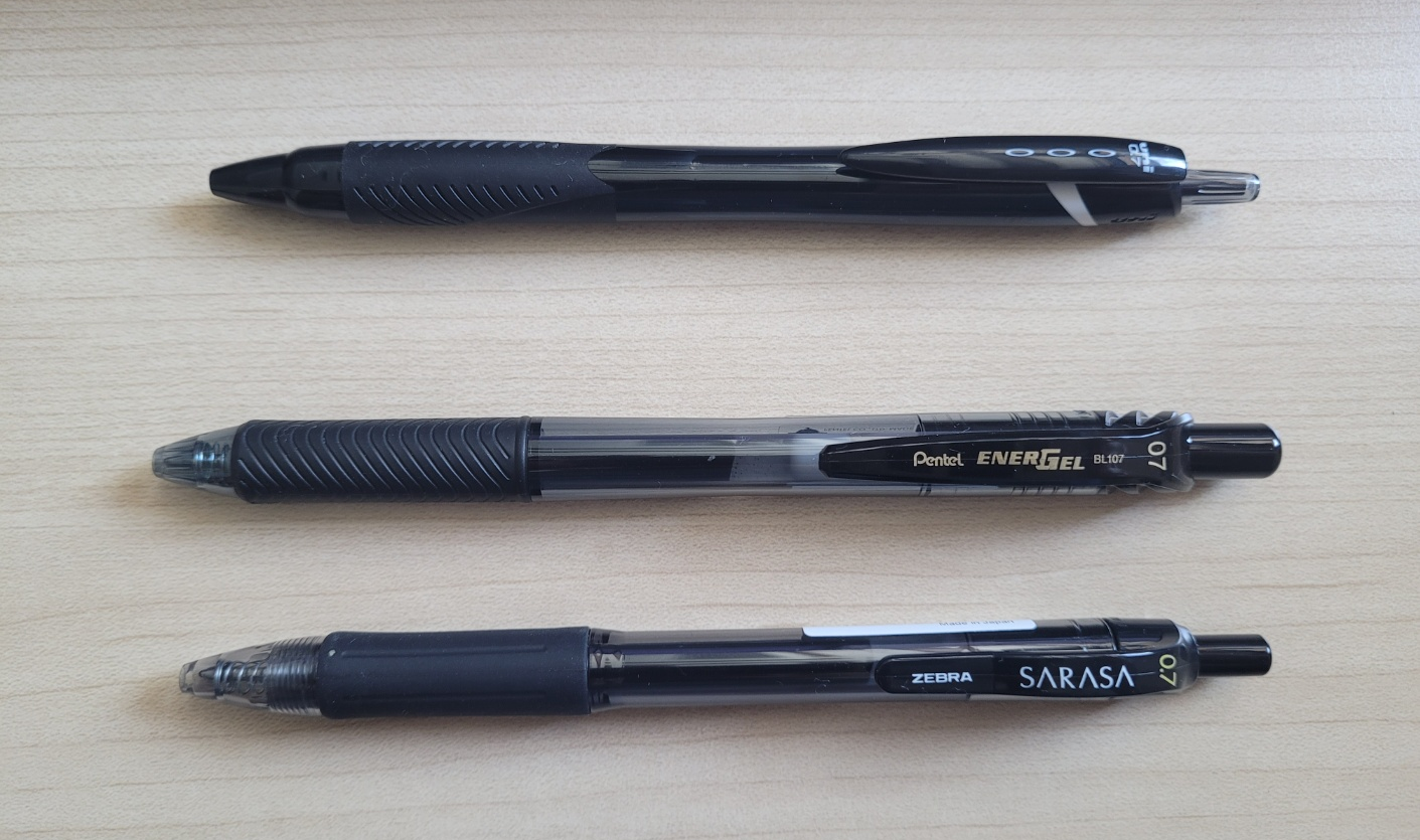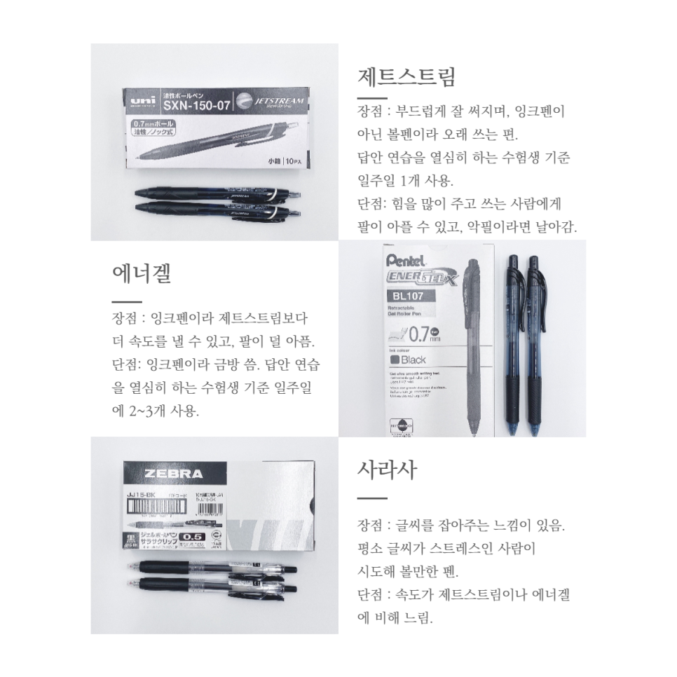동네 문구점에 들러서 고시생들이 주요 쓰는 펜을 구입했습니다. 위에서 아래로 제트스트림, 에너겔, 사라사입니다. 제트스트림은 볼펜이고, 에너겔과 사라사는 잉크펜입니다. 필기감은 에너겔이 가장 좋았고, 손에 힘이 적게 들어가는 것 같습니다. 노트 필기에는 제트스트림이 적당할 것 같고, 일상 서류 작성 등이나 장문을 쓸 때는 에너겔이나 사라사를 쓰는 것이 편할 듯 합니다.