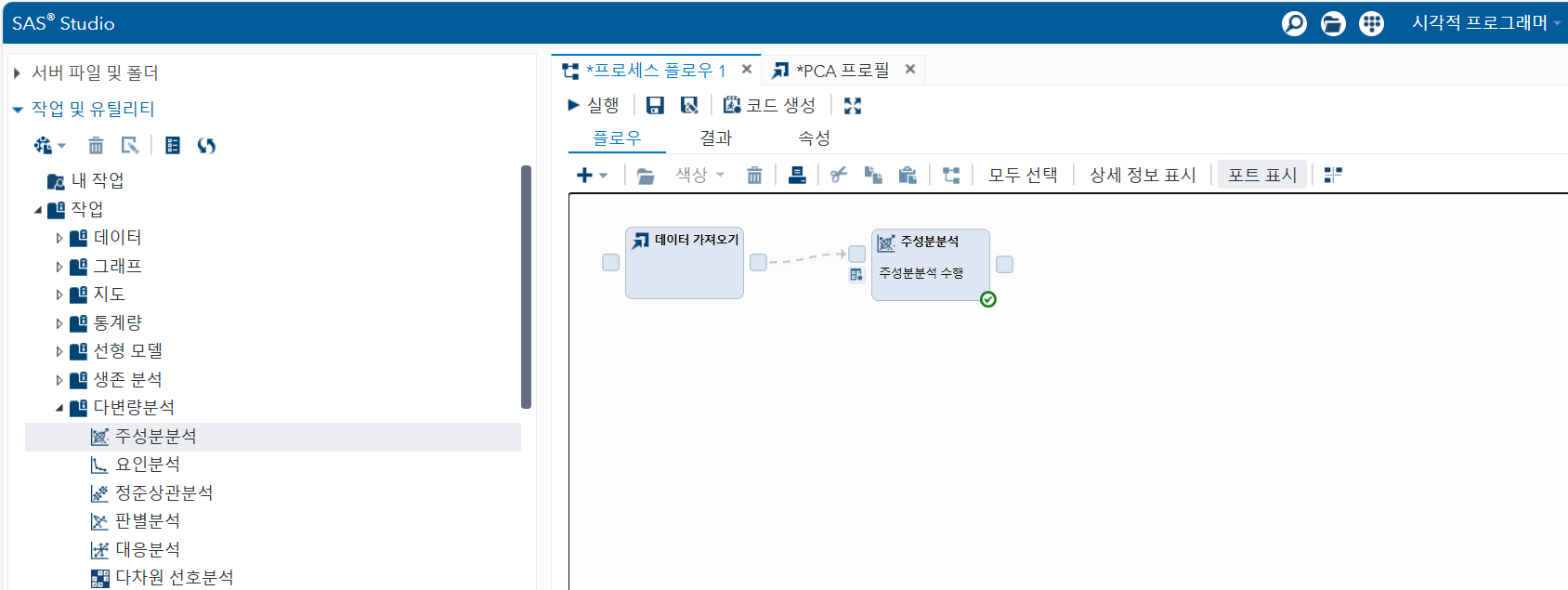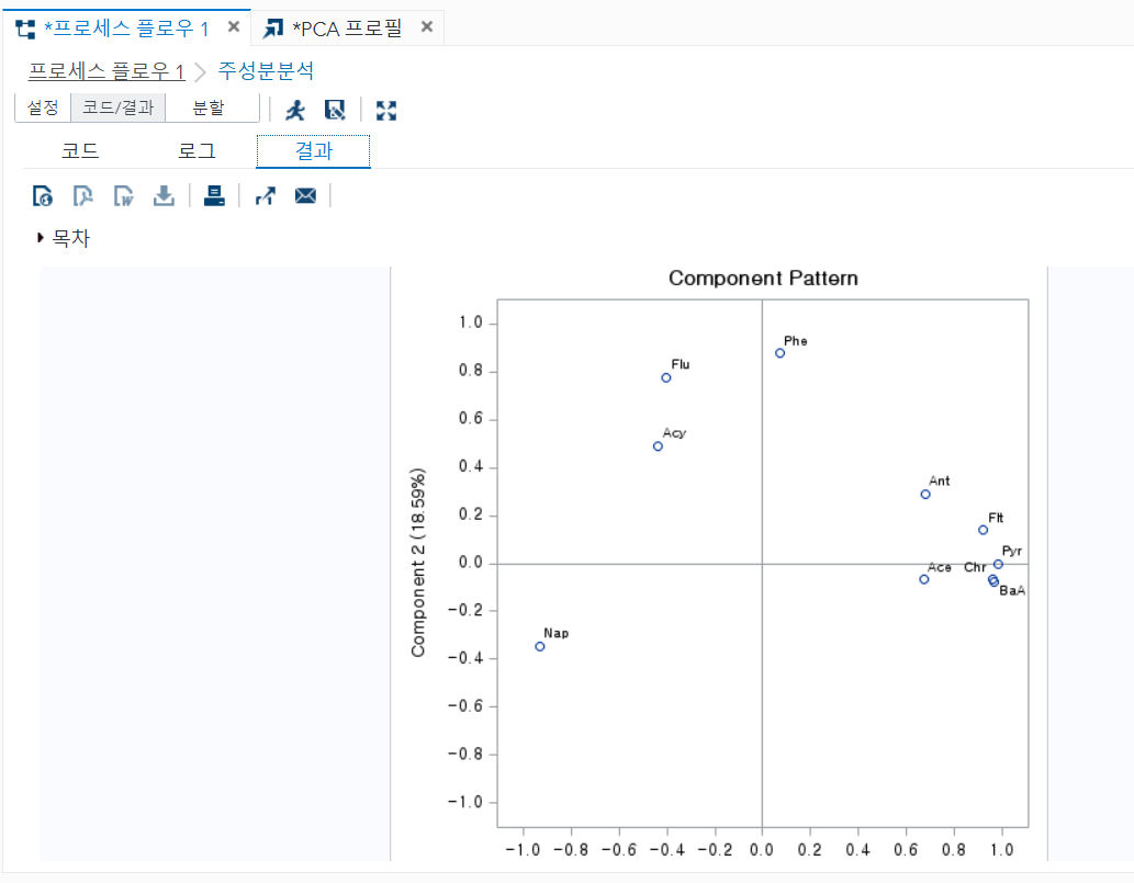 다음에는 시각적 프로그래머 창에서 자료를 불러오고 PCA를 수행했습니다. 드래그 앤 드랍 방식으로 코드만 사용하는 것보다 시간이 걸립니다. 그러나 코드를 몰라도 통계처리를 할 수 있어서 선호하는 학생들이 많을 것 같습니다.