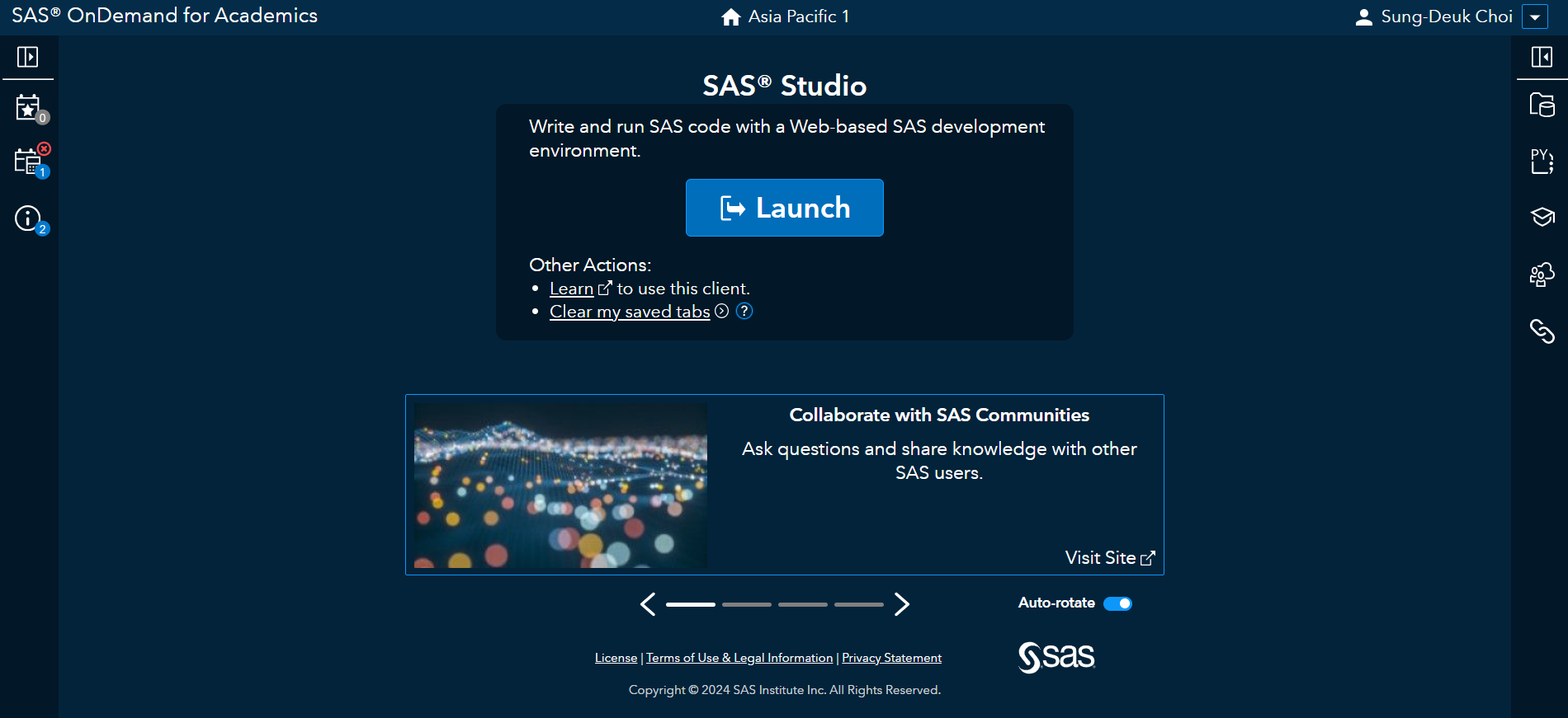 SAS Profile을 만든 후에 Sign In을 하면 아래 화면이 나옵니다. Launch를 클릭하면 SAS가 실행됩니다.