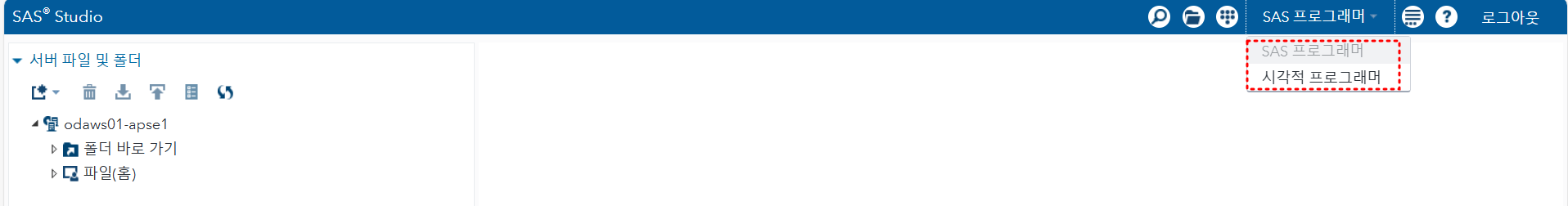 실행화면 상단입니다. 우측에 SAS 프로그래머를 선택하면 코드 위주로 통계처리를 하는 것이고(R, 파이썬과 유사), 시각적 프로그래머를 선택하면 드래그 앤 드롭을 사용해서 코드를 몰라도 통계처리를 할 수 있습니다.