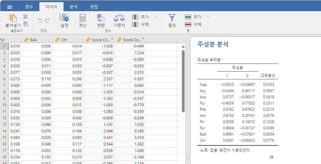 PCA 결과입니다. 적재값(loading)은 표에 나와 있습니다. 점수값(score)는 좌측 하단의 저장 메뉴에서 주성분 점수를 선택하면 시트에 추가됩니다.