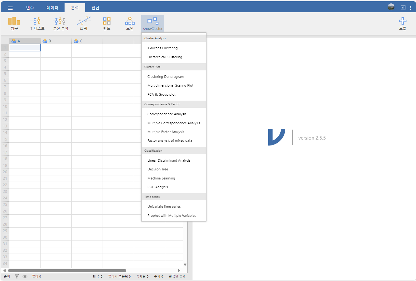 우측 상단에 보이는 모듈 추가 메뉴를 클릭해서 snowCluster 모듈을 추가했습니다. 저자가 한국인이네요.