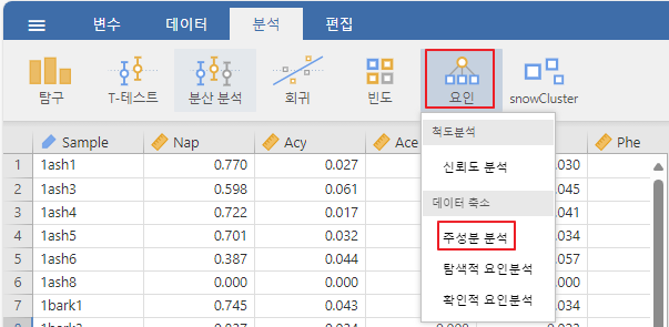 JASP와 마찬가지로 요인분석 아래에 주성분 분석(PCA)가 나옵니다. SPSS를 그대로 따르고 있습니다.