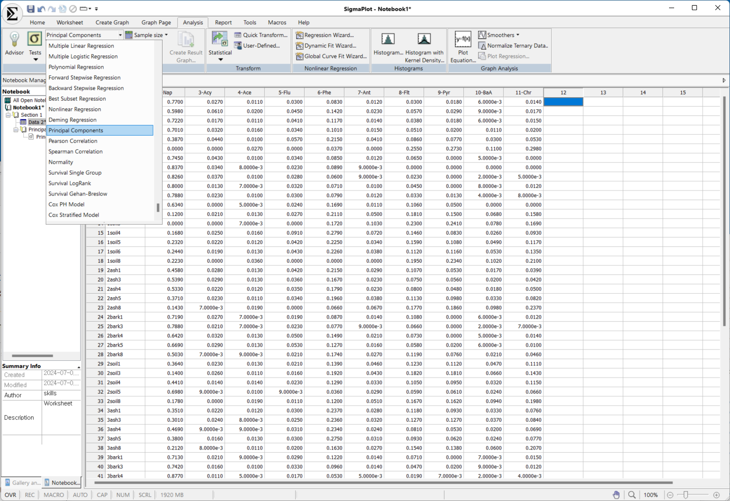 SigmaPlot으로도 PCA가 가능합니다. 우선 통계탭에서 PCA를 찾아서 클릭합니다.