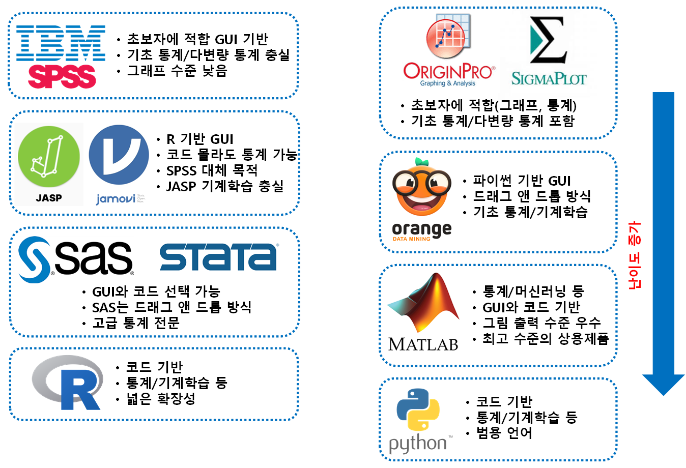 제가 사용한 통계 소프트웨어 전반적인 사항을 아래 그림에 정리했습니다. 참고해서 본인 수준에 맞게 사용하면 됩니다.