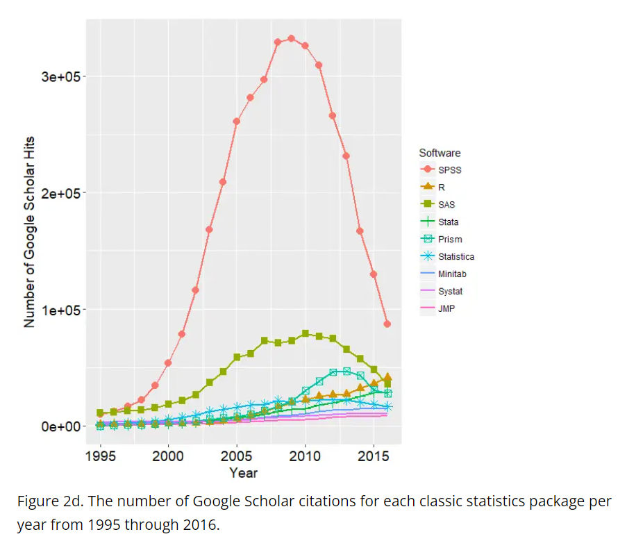 구글 스칼라에서 검색한 학술 논문 중에서 SPSS를 언급한 논문이 2010년 전후로 급격히 감소했습니다. SAS도 마찬가지입니다. 대신 R과 STATA가 상당히 증가했습니다.