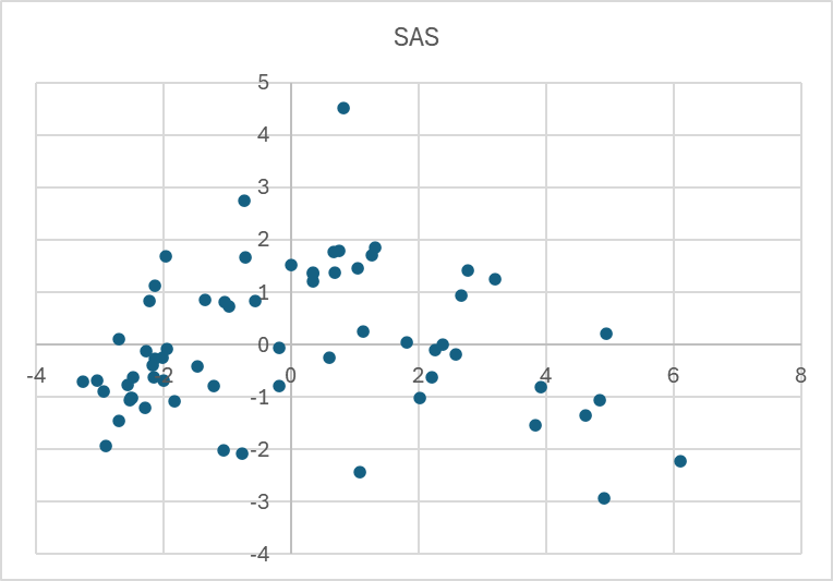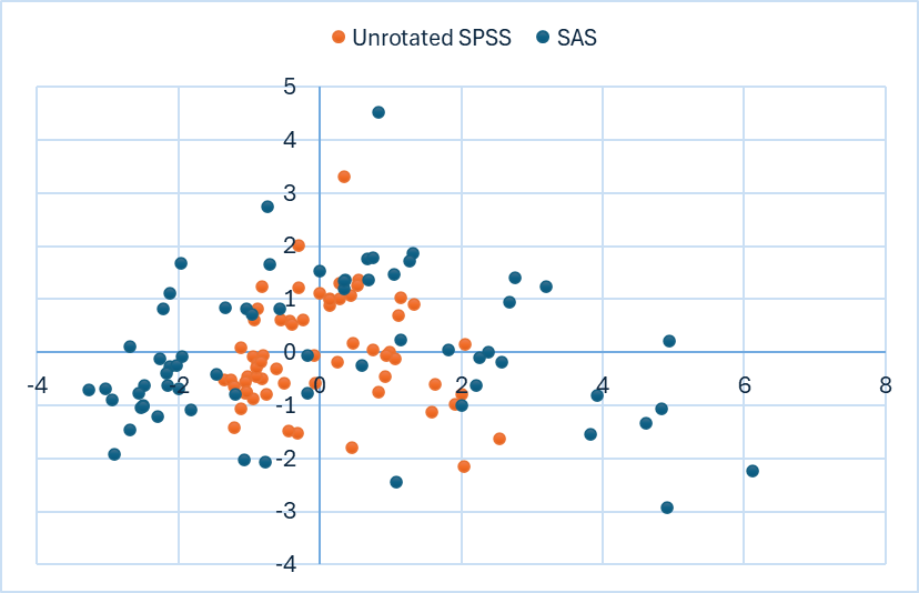 SPSS (= JASP, jamovi)로 산출한 PCA 결과는 SAS (= STATA, MATLAB, Orange, R, Python, SigmaPlot, OriginPro) 결과와조금 다릅니다. 점수 그림(score plot)의 시료 분포 경향이 전반적으로 비슷한데 값은 차이가 있습니다. 아래 두 산포도의 경향은 거의 비슷합니다. 그런데 자세히 보면 수치가 다릅니다. 가장 위에 있는 점을 보면, SPSS에서는 Y축 값이 3과 4 사이에 있는데, SAS에서는 4와 5 사이에 있습니다.