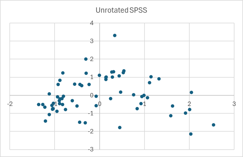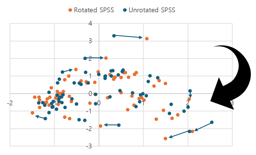 SPSS에서 회전 유무에 따른 점수그림 변화를 살펴 봤습니다. Varimax 회전에 의해 시료의 위치가 시계 방향으로 회전한 것을 알 수 있습니다. 시료 위치가 전체적으로 이동했지만 전반적인 시료 분포 경향은 별다른 변화가 없으므로, 회전 여부에 따라서 PCA 결과해석은 달라지지 않습니다. 앞으로는 다른 소프트웨어 결과와 직접 비교하는 것을 염두하여 SPSS로 PCA를 할 때는 직교회전 옵션을 선택하지 않고자 합니다.
